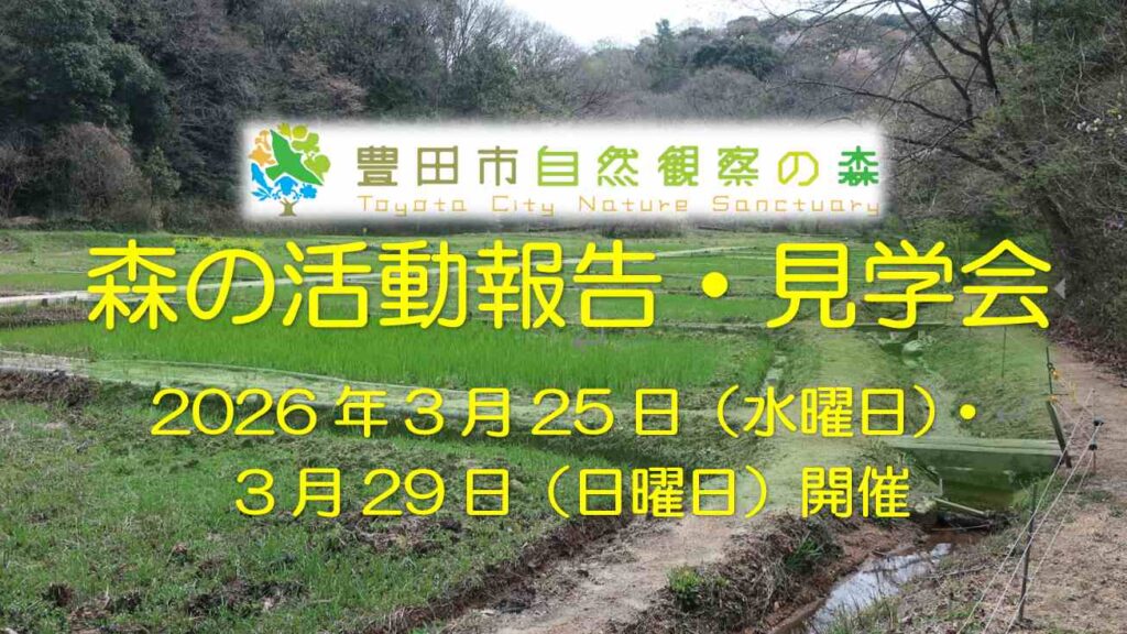 トップページ 2024.02.142026.03.05 イベント申込 森の自然 利用案内 アクセス マップ 森のルール イベント 利用案内 アクセス マップ 森の自然 ルール イベント お知らせ ラムサール条約湿地「東海丘陵湧水湿地群」とは。 2026.03.05 (追加2/20)【観察路情報:予告】観察路での作業について 2026.02.132026.02.20 1月25日(日)糸のこ工作教室中止のお知らせ 2026.01.212026.02.12 森のガイドマップが新しくなります。 2025.12.112026.02.12 お知らせ一覧 > Instagram 現在、ネイチャーセンター2階で実施中の「鳥の巣とはね展」に、新しい展示を追加しました。 とても珍しい 先日ヨシの湿地に鳥を探しに行ったら・・・いました!ルリビタキ!しかもすぐ近くにとまって写真まで撮らせ 豊田野鳥友の会による展示「豊田の野鳥123」をネイチャーセンター2階で開催中です。 豊田市内の野鳥の 木をよく見てみると、こんなかわいい顔のような形を見ることができます。 この愉快な顔は葉痕といい、もと ニホンアカガエルの卵です。 自然観察の森ではヨシの湿地とトンボの湿地でみられます。 日本で一番早く卵 錦糸卵ではありません。シナマンサクといいます。 花火のようなあまり見た事がない形ですが、これも立派な 「鳥の巣と羽根展」開催中です! 羽根標本や、巣の標本、はく製などを、間近で観察することができます。 外周ルートから古瀬間団地へ向かう道の一部が通行止めとなります。 期間は2月23日~3月14日で、終日 先日、森を歩いていたらムササビが顔を出しているところに遭遇しました。 夜行性のムササビですが、実は昼 豊田植物友の会による作品展を、ネイチャーセンター2階で開催中です。 豊田市内や三河地方で撮影された、 【観察路情報:作業予告】 いつも豊田市自然観察の森をご利用いただきありがとうございます。 現在、観 ラムサール条約湿地の一つ、恩真寺湿地の保全活動に参加しました! 当日は寒波により雪が降るなかでの作業 えさ台にやってきたヒヨドリです。 赤いほっぺと短い足がかわいい鳥ですが、一口がすごい大きいですね。 苔テラリウムの講座を実施します!2月7日に申込締切です。 コケについて学びながら、ボトルの中に小さ ネイチャーセンター屋上から見る冬の夕暮れは閉館後にしか見ることができない風景です。冬の寒さも相まって もっと見る フォローをお願いします! X(旧twitter)も、よろしくお願いします。 活動報告 スタッフや、ボランティアさんの活動報告です 【ラムサール条約湿地矢並湿地】湿地の保全作業-コガマ刈り 2025.07.26 5/3-5/5 かんさつのもり体感Day 終了しました 2025.05.08 森の自然案内人体験講座2025 受講者募集中! 2025.04.11 【追記:4/3】「とよた自然わくわくクラブ」2025年度の年間スケジュールをアップしました。 2025.03.302025.04.03